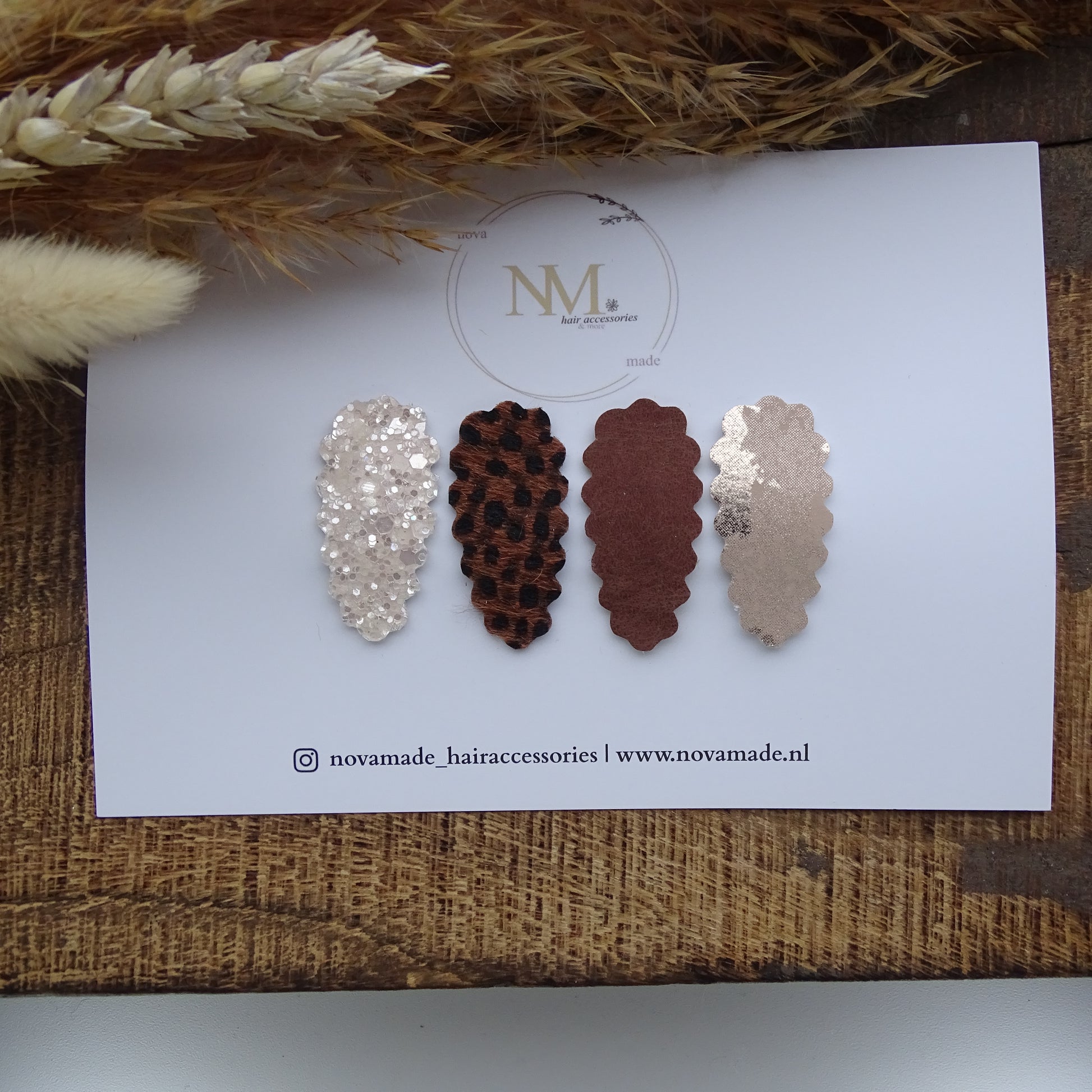 Dit lieve setje van hoogwaardig PU-leer is bevestigd op een anti-slip speld en speciaal ontworpen om elke dag moeiteloos te matchen met de outfit van jouw kleine meid. Tijdloos, stijlvol en praktisch – precies wat je zoekt voor alledaags gebruik én speciale momentjes.