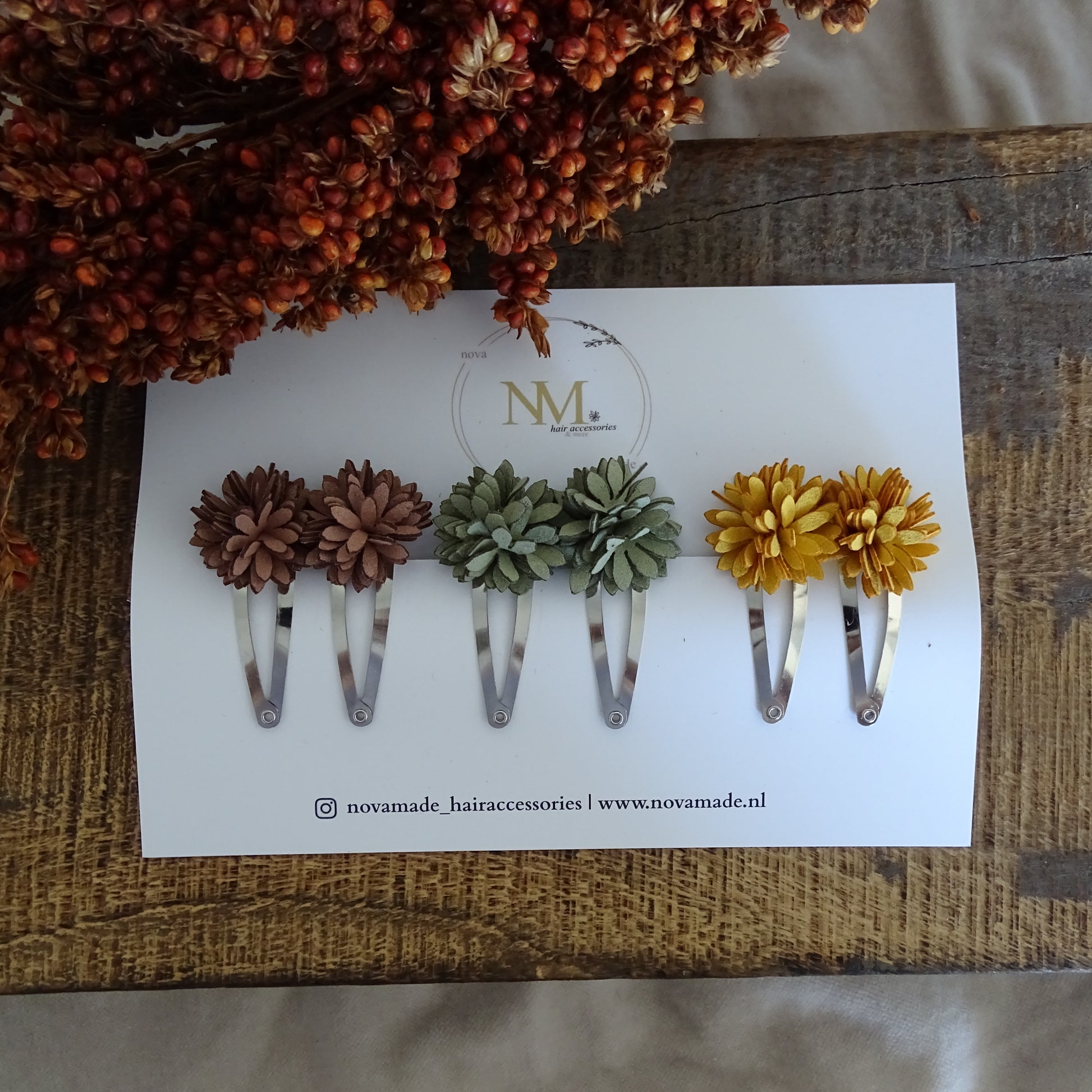 Deze klikklak speldjes van 4 cm zijn afgewerkt met vrolijke bloemen in warme herfsttinten π β perfect om je haar een seizoensgebonden touch te geven