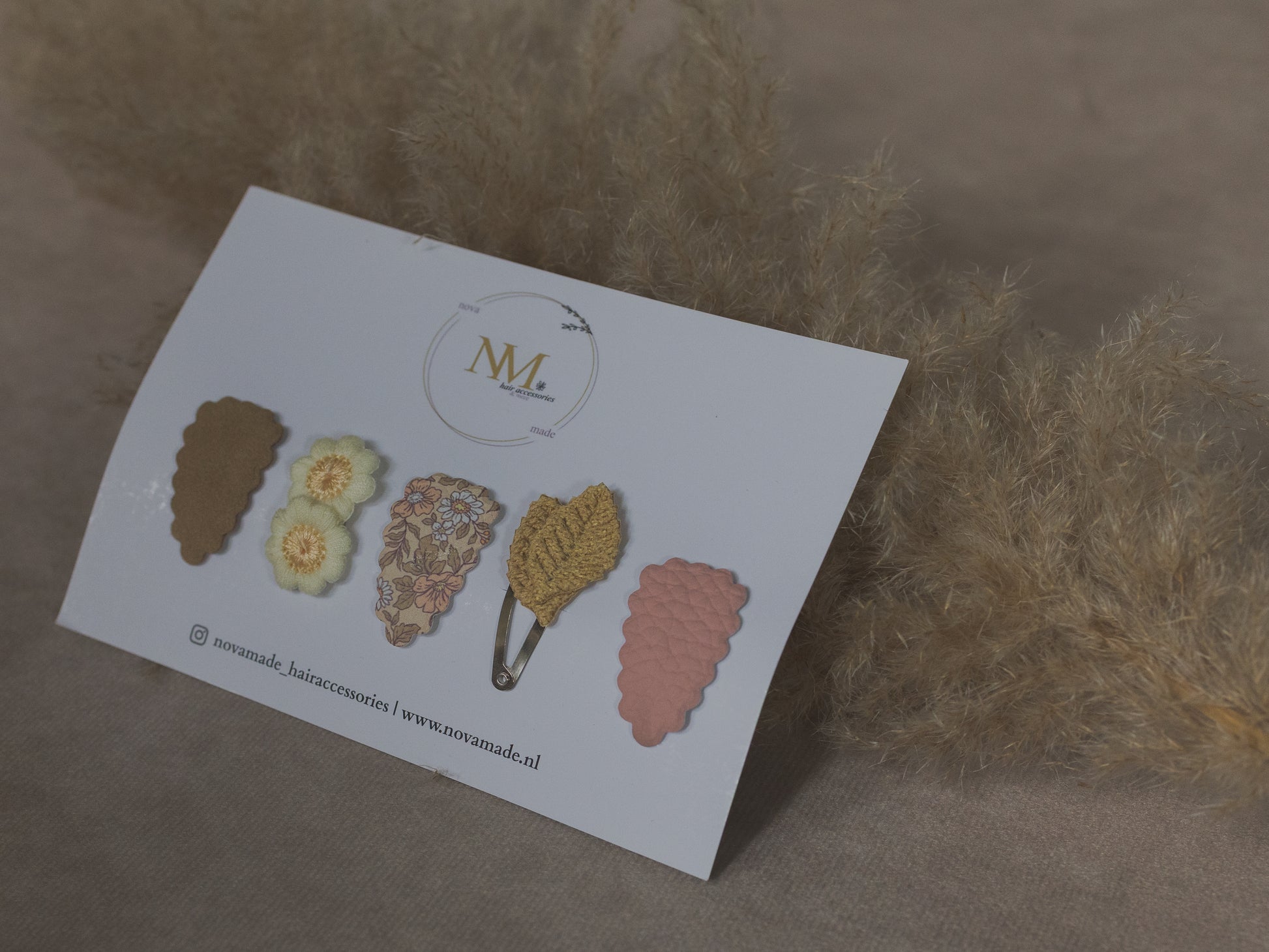 Deze veelzijdige set bestaan uit vijf haarspeldjes in warme herfstkleuren. De combinatie van klikklak speldjes (3cm) en antislip speldjes (2,8cm) maakt dit setje zowel praktisch als stijlvol.