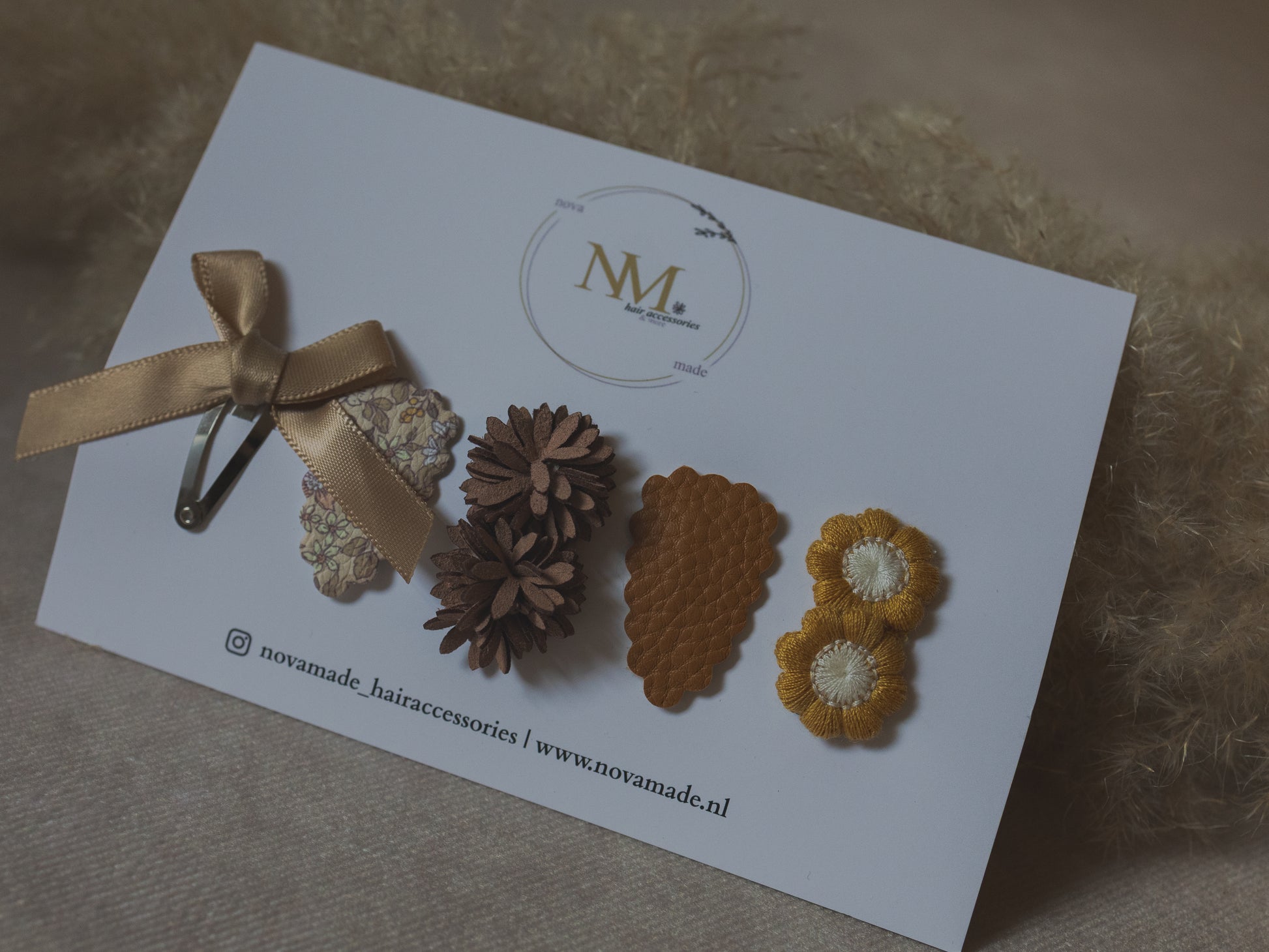 Deze veelzijdige set bestaan uit vijf haarspeldjes in warme herfstkleuren. De combinatie van klikklak speldjes (3cm) en antislip speldjes (2,8cm) maakt dit setje zowel praktisch als stijlvol.